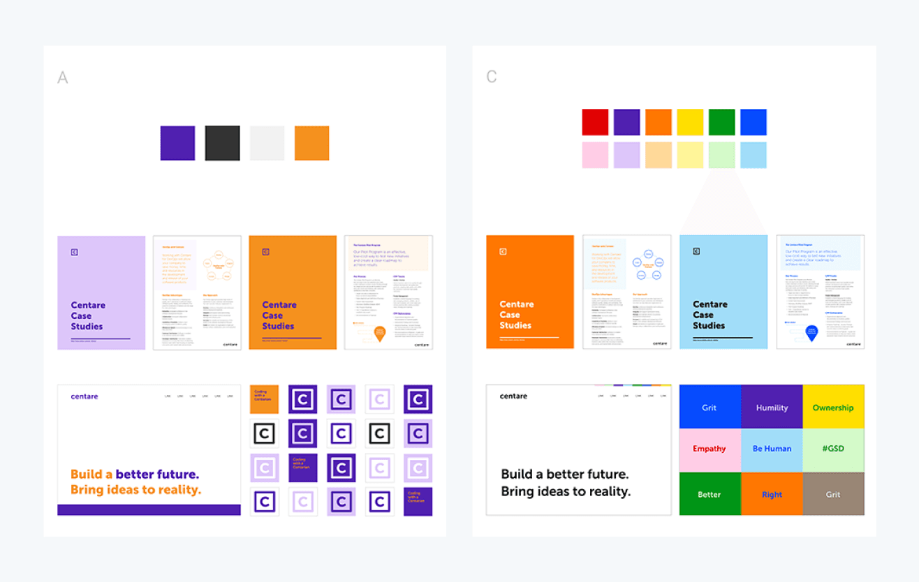 After workshops aligned on brand direction, I led the team through three distinct color palette explorations. Each option represented a different interpretation of the company's personality—giving leadership tangible choices rather than abstract opinions. This made the final decision collaborative and grounded.